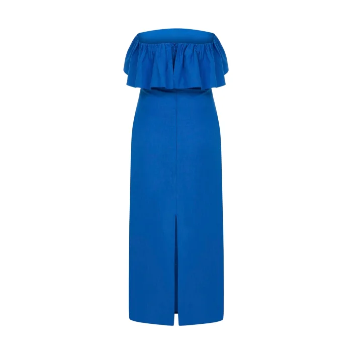 Off-Off-The-Shoulder, Ruffled, Zippered Back, Blue Midi Dress