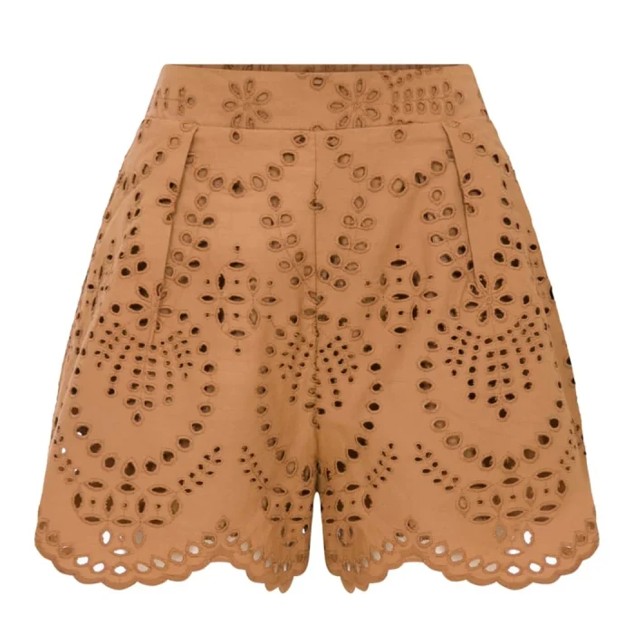Embroidered Detailed, Wave Cut at the Bottom, Lined, Brown Shorts