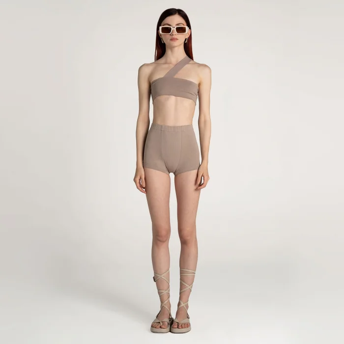 High waist, tight boyfriend boxers. It is thick-striped on white. It is pocketless. It is lycra, flexible.