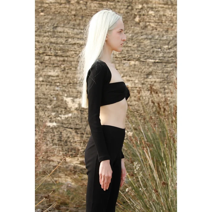 A mini-bolero that covers only the arms. The model wears a size XS in the photo. You can choose it with strapless/sleeveless/strap tops.
