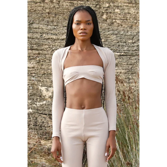 A mini-bolero that covers only the arms. The model wears a size XS in the photo. You can choose it with strapless/sleeveless/strap tops.