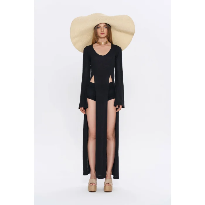 The Deep Slit Knit Dress offers a bold look with its deep slits extending to the navel on the skirt, while its long bell-shaped sleeves balance your proportions.