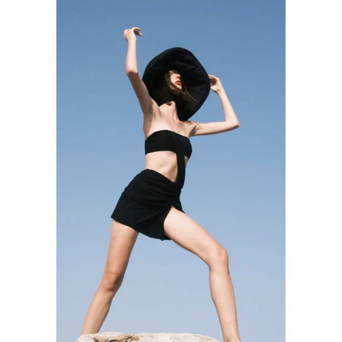 It elegantly ties the chest and underbelly with the same fabric, creating a Z detail. It is mini size. Inspired by the 90s. The model wears a size XS in the photo.