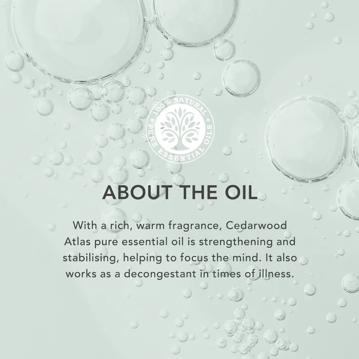 Cedarwood Atlas essential oil is obtained from the Cedarwood Atlas tree, which can reach 40 meters in length and evokes the magnificent forests of Morocco; It has a woody, warm and rich scent. Cedar Tree Oil, also known as cedar oil, was used by ancient civilizations in medicine, cosmetics, and perfumery. They are especially known for the Egyptians' use of cedar oil in the mummification process. Its warm, rich scent works well as a decongestant in times of illness and can help relieve cough and cold symptoms when used in a diffuser or steam inhalation mixture. Cedar wood is the essential oil you can use when you want to help transform negativity into positivity and move forward with courage and strength