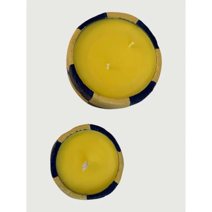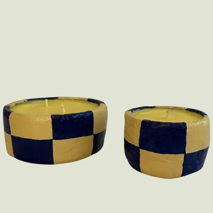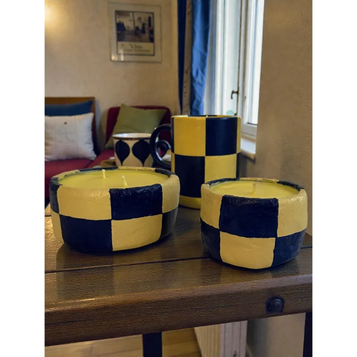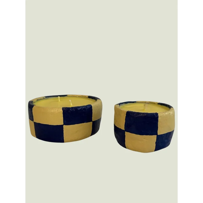 A handcrafted candle series featuring a modern blue–yellow grid pattern. Each piece is individually painted and poured, offering a unique texture. Minimal, vibrant, and ideal as a decorative accent.