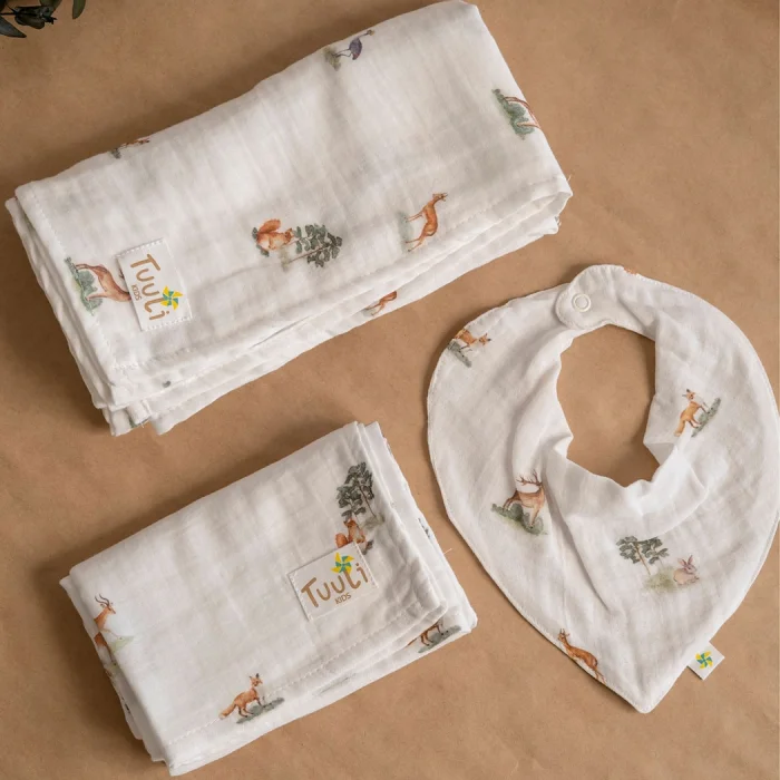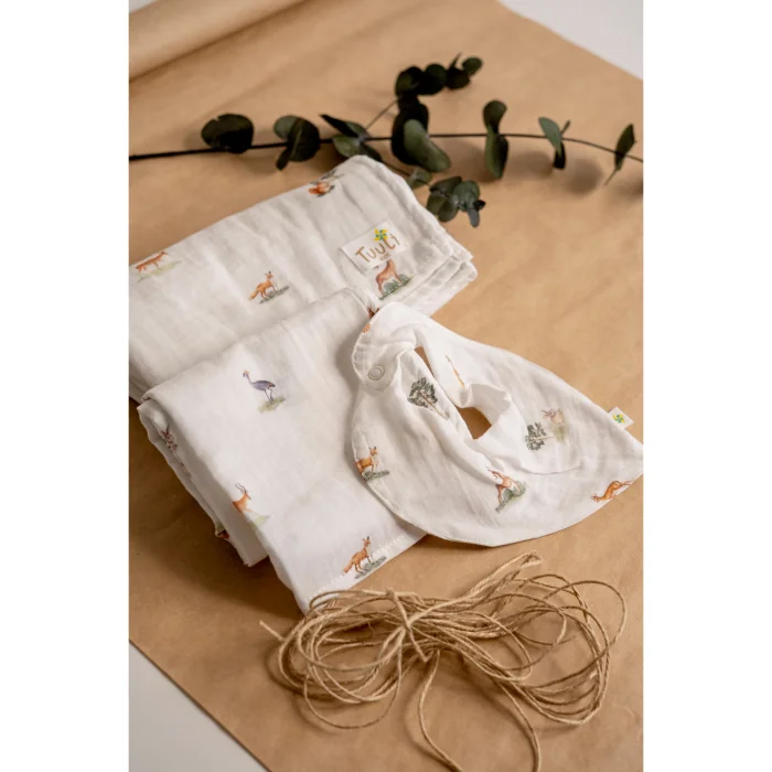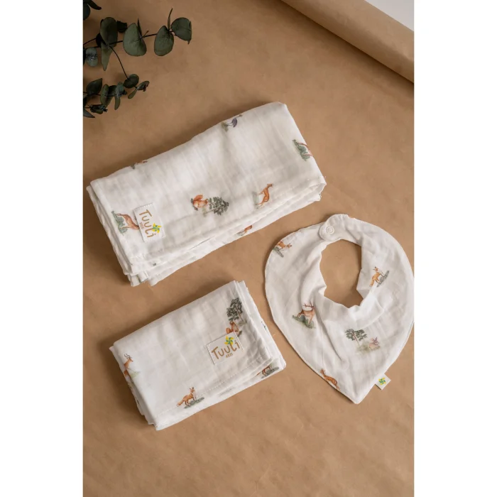 Muslin set made of 100% organic cotton, GOTS certified, with anti-allergic fabric. It offers comfort and elegance to your baby with its specially designed patterned soft pieces.