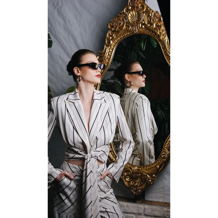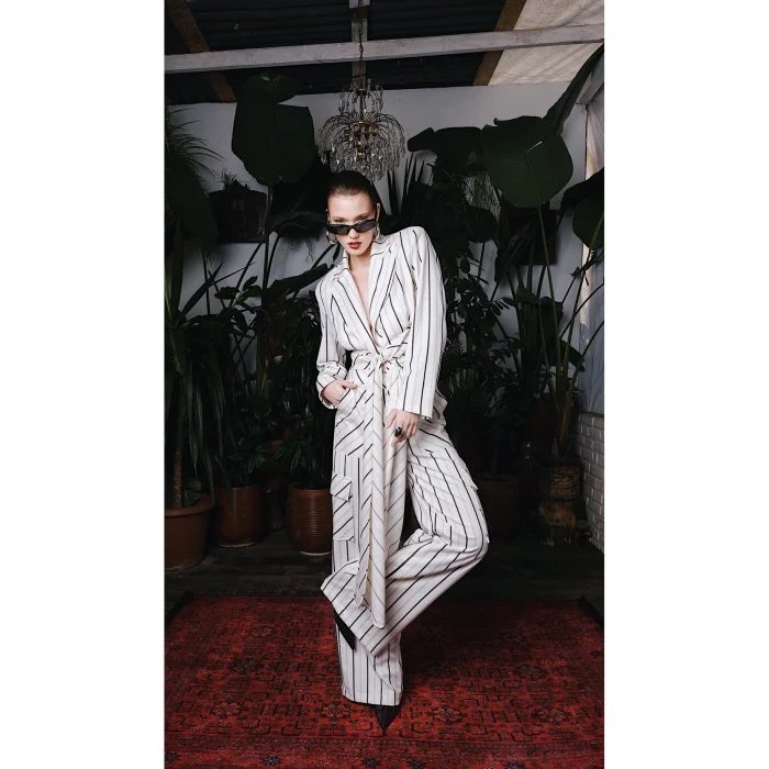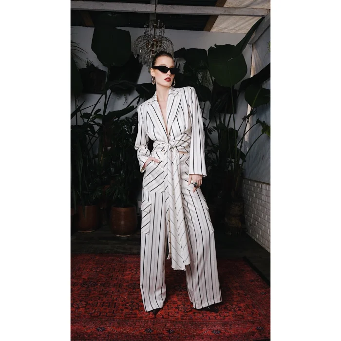 Jacket with long belt at the front, wide-leg cargo trousers with pockets on the sides. It is sold as a set.