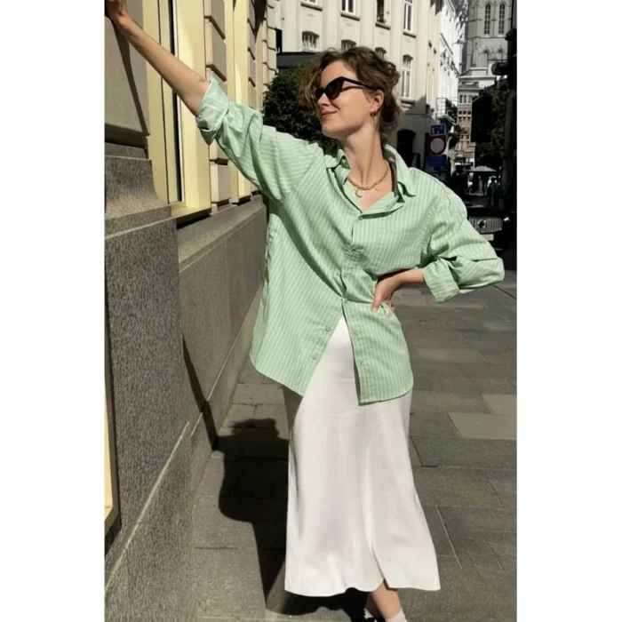 It is designed for you to experience elegance and comfort together at every moment. The 100% cotton long-sleeved striped women's shirt offers comfort all day long with its breathable structure. Thanks to its natural texture, you can choose a style that is both stylish and sustainable. While reflecting the energy of nature in your style, make a difference with your environmentally friendly choices. A timeless piece for both everyday wear and special moments. Care Instructions: Machine wash on low heat with similar colors. Use only chlorine-free bleach if necessary. Do not tumble dry, iron inside out. Keep away from fire.
