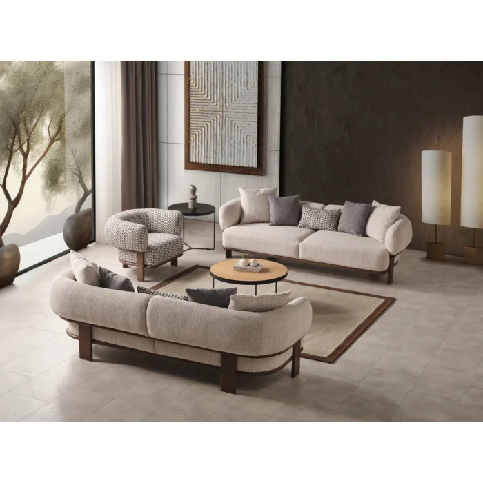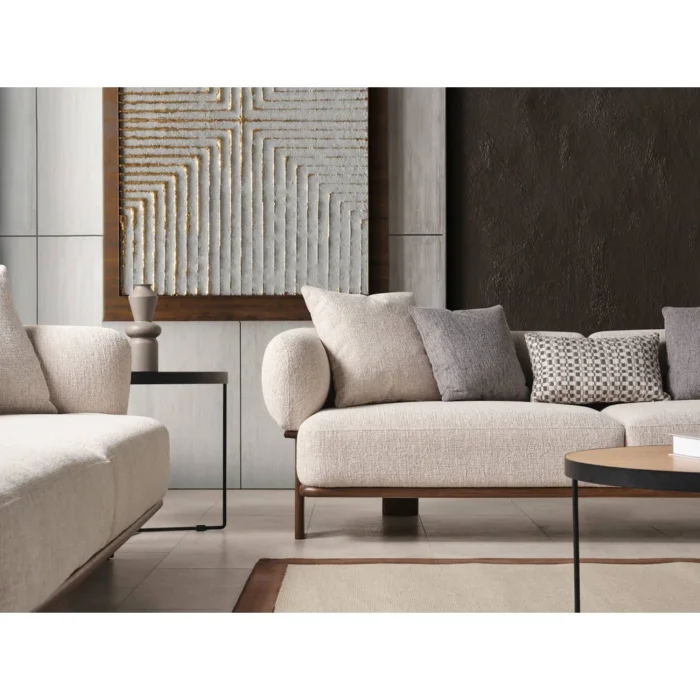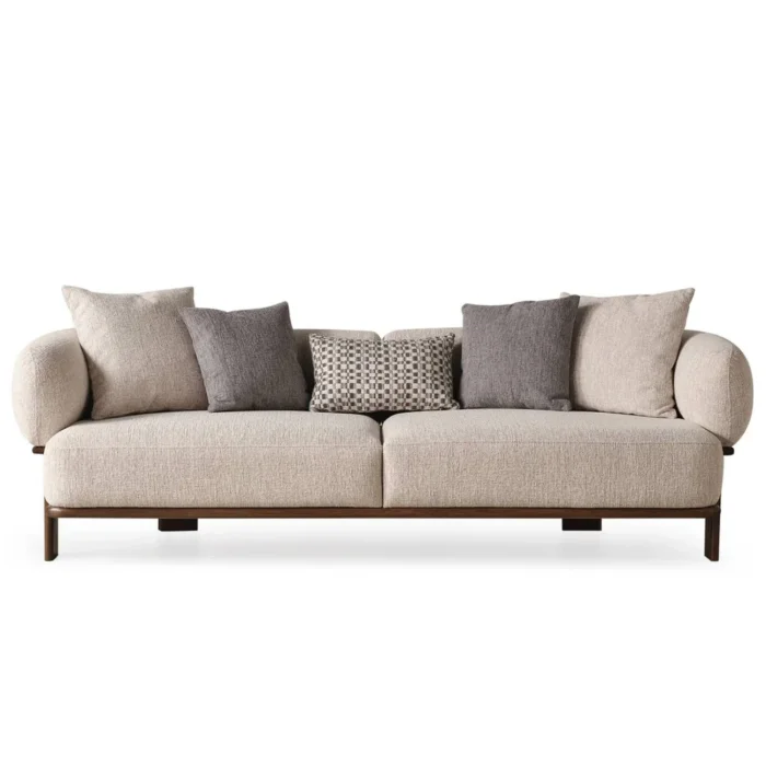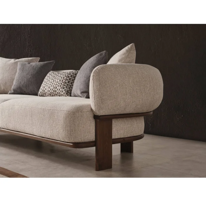 Combining comfort and elegance, Klara Sofa adds a warm touch to your living space. While the wooden details on its skeleton offer a natural aesthetic, it also maximizes comfort with its linen cotton blended fabric. Klara brings peace and elegance to your home with a modern and minimalist design. Natural Wood Details: The wooden details on the frame of the sofa add a natural warmth and elegance to your room. Details designed with warm tones of wood make Klara unique. Comfortable Sitting Experience: With its soft and durable linen cotton blend fabric, Klara provides a high level of comfort in long-term sitting experiences. It perfectly supports your back and body, offering a relaxing session. Stylish and Minimalist Design: The simplicity and elegance that lie at the core of Scandinavian design show itself in Klara Sofa. With its clean lines and elegant details, it fits perfectly into your modern living spaces. SIZE: Width: 230 cm, Depth: 90 cm, Seat height: 43 cm USAGE IDEAS: You can combine it with Klara Armchair and use it as a set. You can contact us for your special size and color requests. DELIVERY: Product delivery time is 5 weeks. This date may vary for special production products.