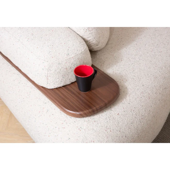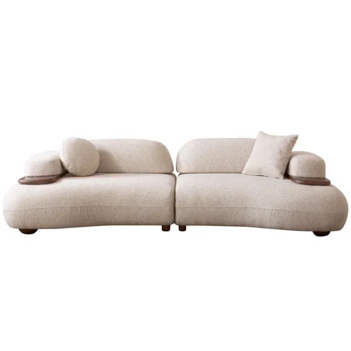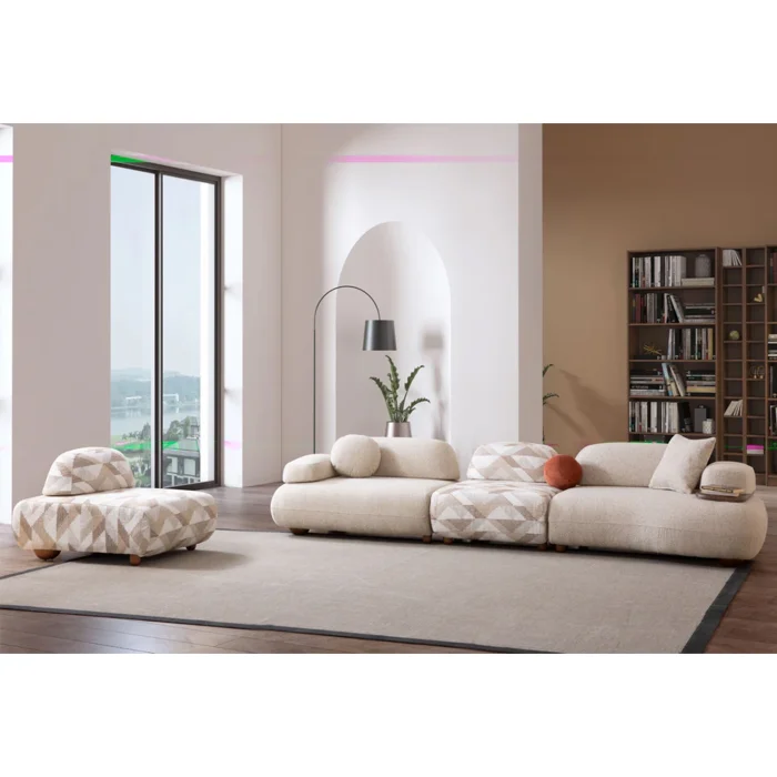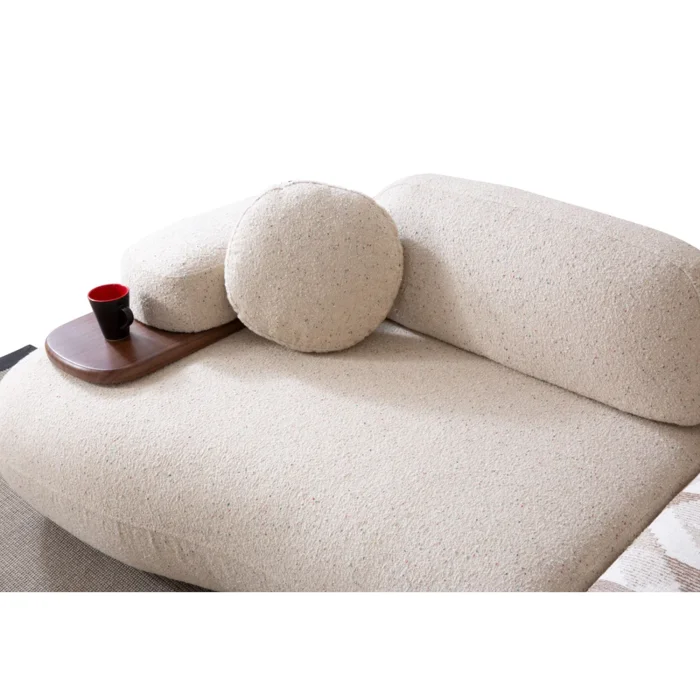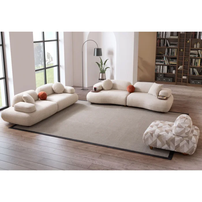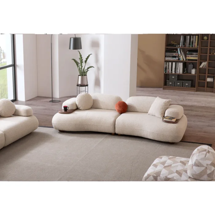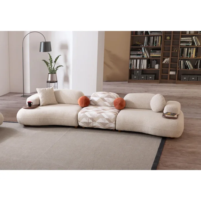 Pera 4-seat sofa is designed to create a unique and natural atmosphere in every corner of your home. Thanks to its soft texture and ergonomic design, it allows you to rest comfortably. Thanks to its modular structure, it can be combined in different ways, so it can be easily adapted to your space and needs. This armchair, which appeals to the eye and prioritizes comfort with its organic forms, offers a timeless elegance with its minimalist details and natural color tones. SIZE: Width: 265 cm Depth: 105 cm Height: 67 cm MATERIAL: The skeleton was made of beech wood. The fabric is woven fabric. USAGE IDEAS: You can combine it with Pera Bergere and Pera 3-seat sofa and use it as a set. You can contact us for your special size and color requests. Throw pillows are included in the price. DELIVERY: Product delivery time is 5 weeks. This date may vary for special production products.