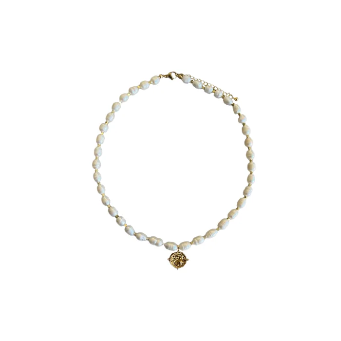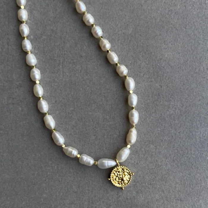 Luna necklace is gold-plated on brass and decorated with pearls. At the tip is the pole star. It is 20 cm. Thanks to the adjustment part on the back, it can be extended up to 25 cm. It is sent with a special box.