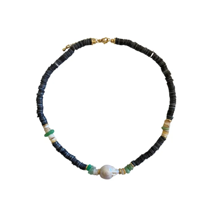 Cove necklace is designed using pearls and natural stones. Inspired by the sea of ​​the Aegean. It is 20 cm. It can be extended up to 25 cm with the adjustment part on the back. It is sent with its special box.