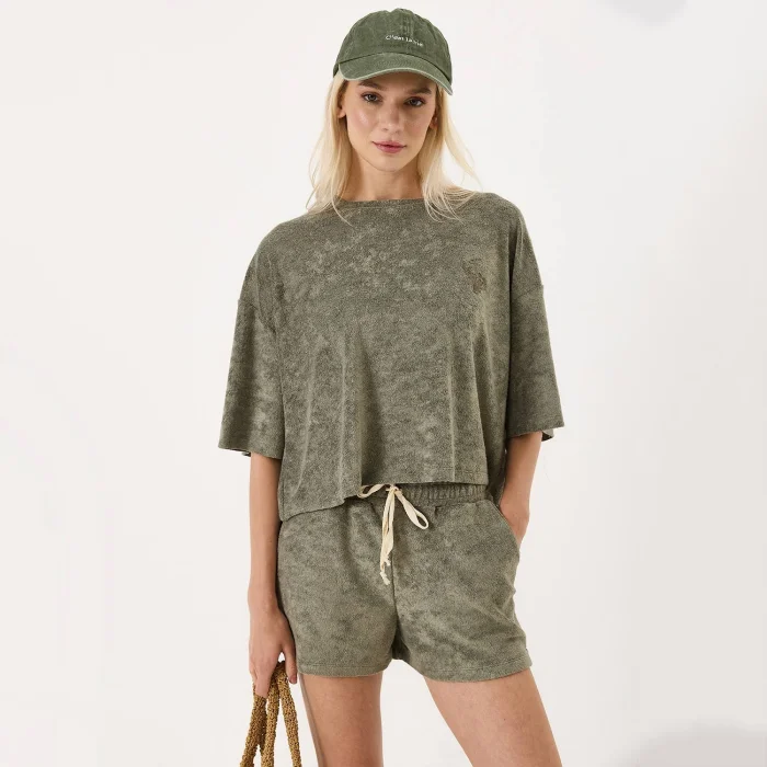 The Oversize Towel T-shirt with Natural Embroidery Detail, specially designed by VAYU for the summer season, adds a unique interpretation to the summer style of the urban woman with its lightness, elegant texture and simple embroidery inspired by nature. Made with special thin terry fabric, this t-shirt offers all-day comfort with its softness and breathable structure.