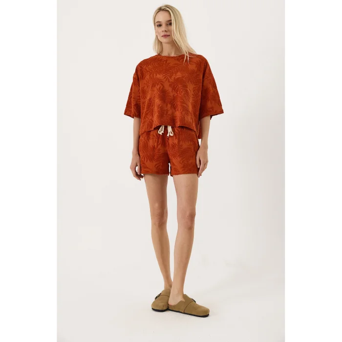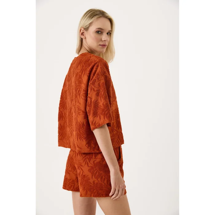 The Oversize Towel T-shirt with Natural Embroidery Detail, specially designed by VAYU for the summer season, adds a unique interpretation to the summer style of the urban woman with its lightness, elegant texture and simple embroidery inspired by nature. Made with special thin terry fabric, this t-shirt offers all-day comfort with its softness and breathable structure.