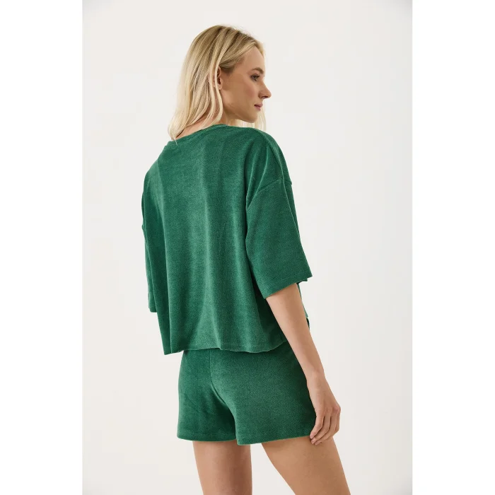 The Oversize Towel T-shirt with Natural Embroidery Detail, specially designed by VAYU for the summer season, adds a unique interpretation to the summer style of the urban woman with its lightness, elegant texture and simple embroidery inspired by nature. Made with special  thin terry fabric, this t-shirt offers all-day comfort with its softness and breathable structure.