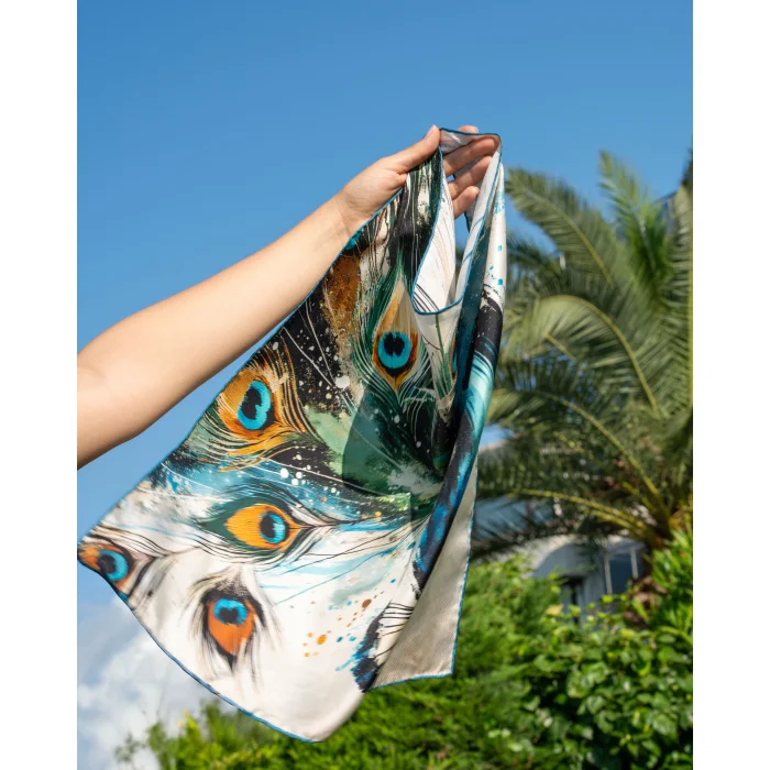 Material and weaving type: 100% Pure Silk Satin 14mm Size: 52x52 Edge seams are handcrafted. It is finalized by hand sewing.