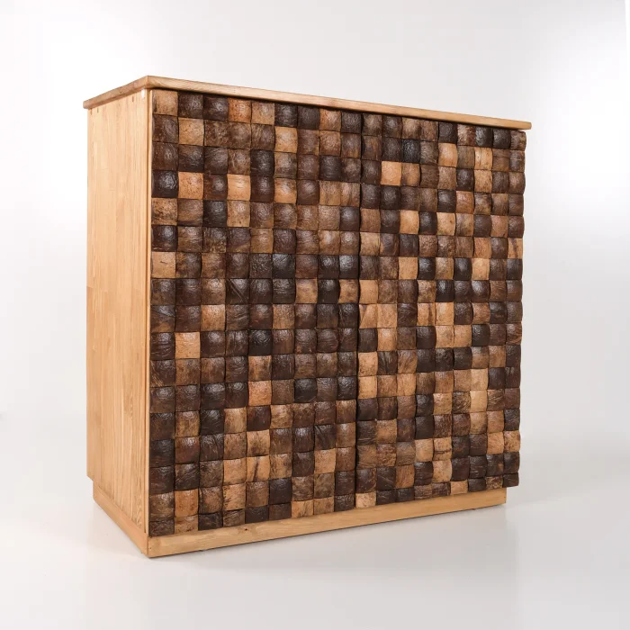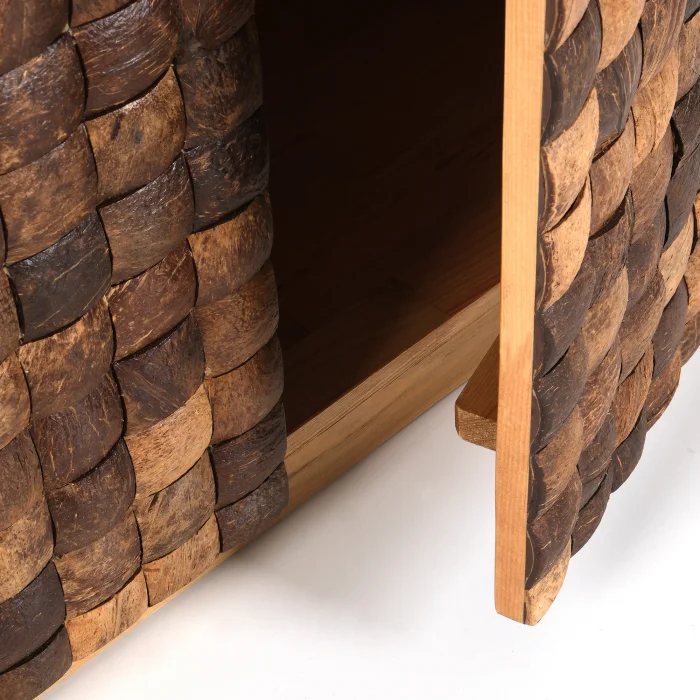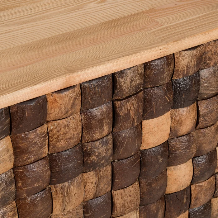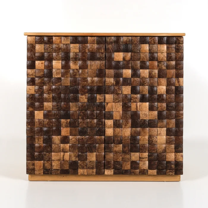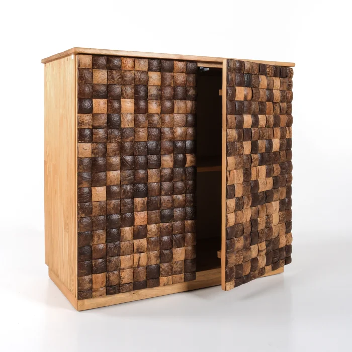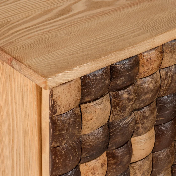 Coconut Cabinet is a unique piece produced with nature's purest material. Its case is made of solid spruce wood, and the lid surfaces are created by handcrafting and placing real coconut shells one by one. Each piece of shell is unique in its texture and color. It brings an elegant contrast to both modern and rustic spaces.