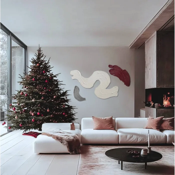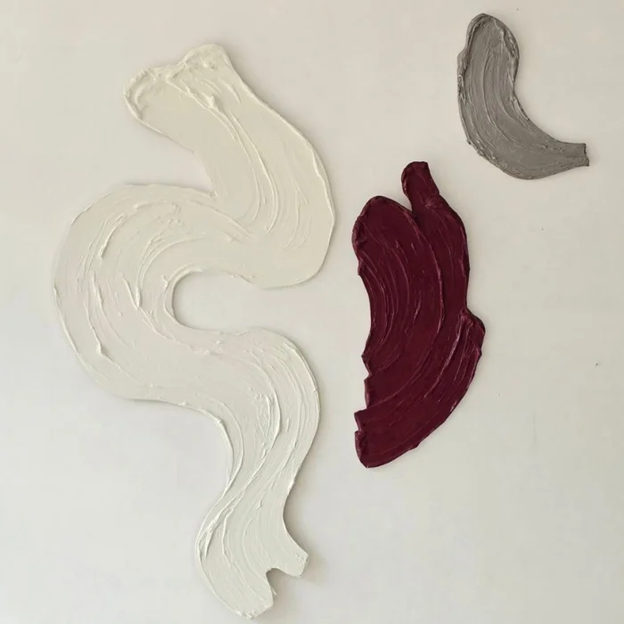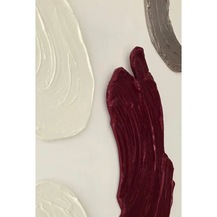 A set of three parts. A completely handmade relief with polymer material on a shaped MDF background, covered with colored acrylic paint and glossy varnish. Each piece of this set can be purchased separately or combined in different combinations. Hanging apparatus is included in each piece. Dimensions and colors:Total board in the photo: 153 × 120 cm; letter "n": 80 × 32 cm, burgundy color RAL 3005; Letter "W": 153 × 84 cm, white color RAL 9010; Letter "e": 38 × 37 cm, color INOX.