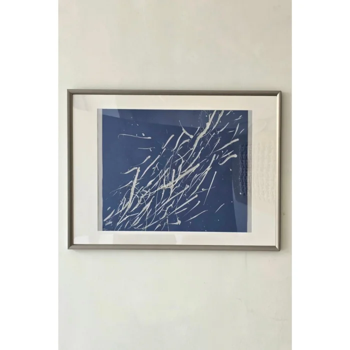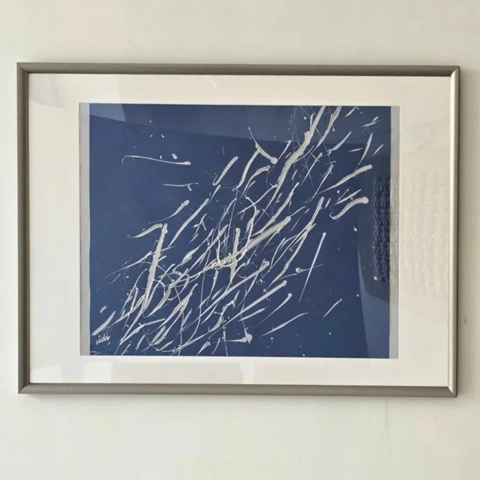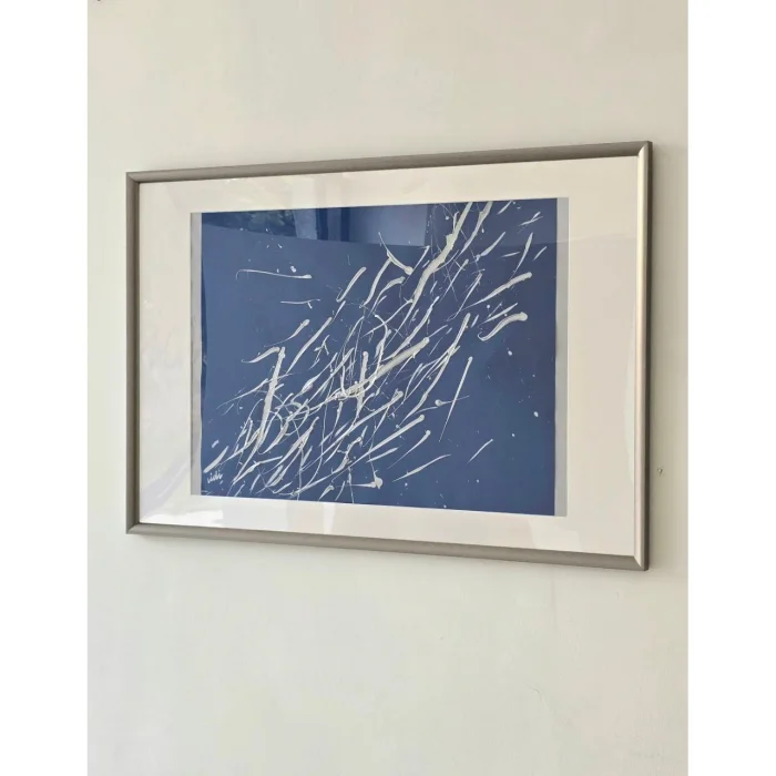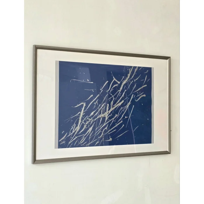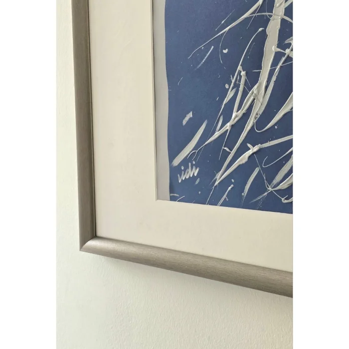 Colored heavy weight paper, acrylic paint, silver frame, white passe-partout, plexi glass. There is both vertical and horizontal hanger.