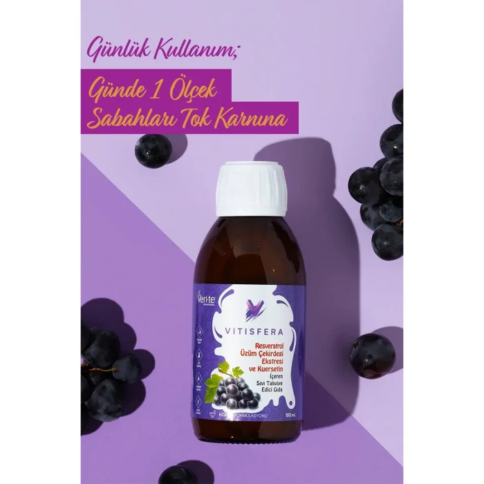 Resveratrol in the content of Vitisfera Resveratrol Shot Forest Fruits Flavored Food Supplement is obtained from Veri-Te®, Switzerland's registered and patented trans-Resveratrol brand, while Quercetin is obtained from Sophorae Japonica plant with 95% purity and Grape Seed Extract is obtained from natural grape seed with 96% purity.