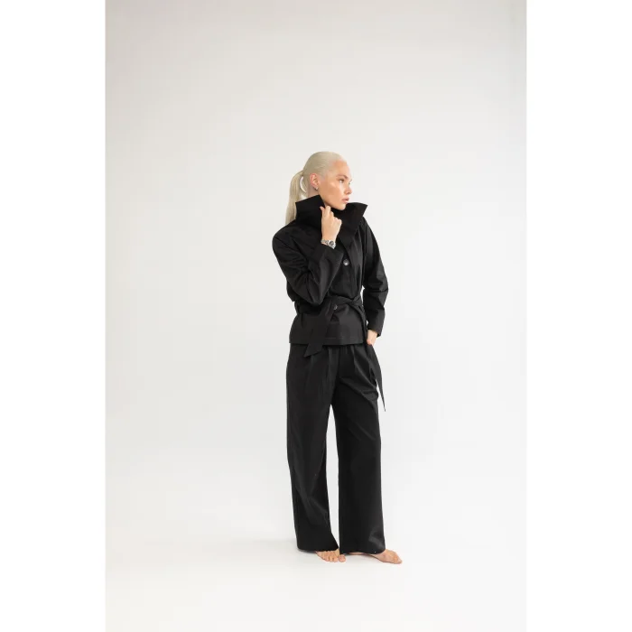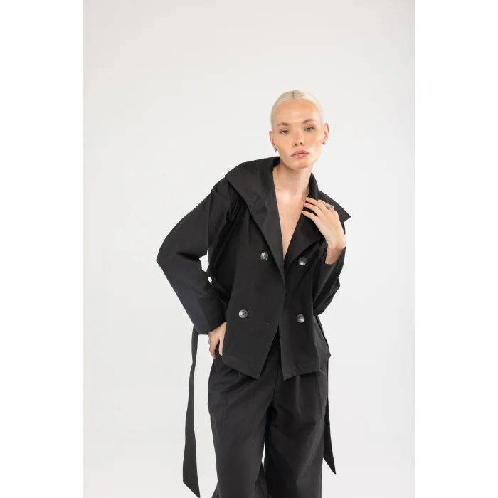 Offering a modern interpretation of classic trench coat lines, this model has a timeless stance with its simple design. It creates a balanced silhouette with its form-preserving cotton fabric, prominent collar and belt detail that fits around the waist. It is a powerful complement to evening looks as well as in everyday urban style.