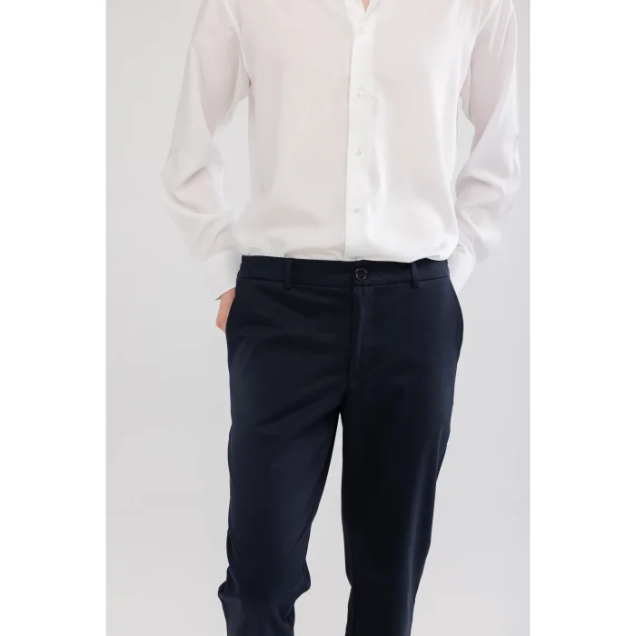 Adding comfort to modern urban style, these navy blue trousers offer an elegant look thanks to their slightly shiny surface while maintaining their form with their thick textured cotton fabric. Elastic panels on the sides of the waist provide freedom of movement and all-day comfort. The slightly tapered leg cut strikes an ideal balance between classic and comfortable.