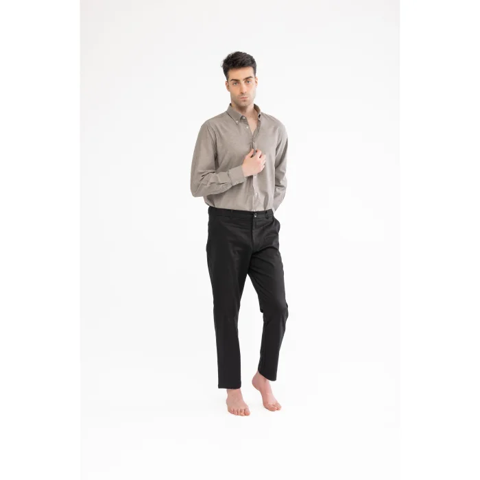 Adding comfort to modern urban style, these navy blue trousers offer an elegant look thanks to their slightly shiny surface while maintaining their form with their thick textured cotton fabric. Elastic panels on the sides of the waist provide freedom of movement and all-day comfort. The slightly tapered leg cut strikes an ideal balance between classic and comfortable.