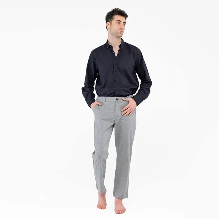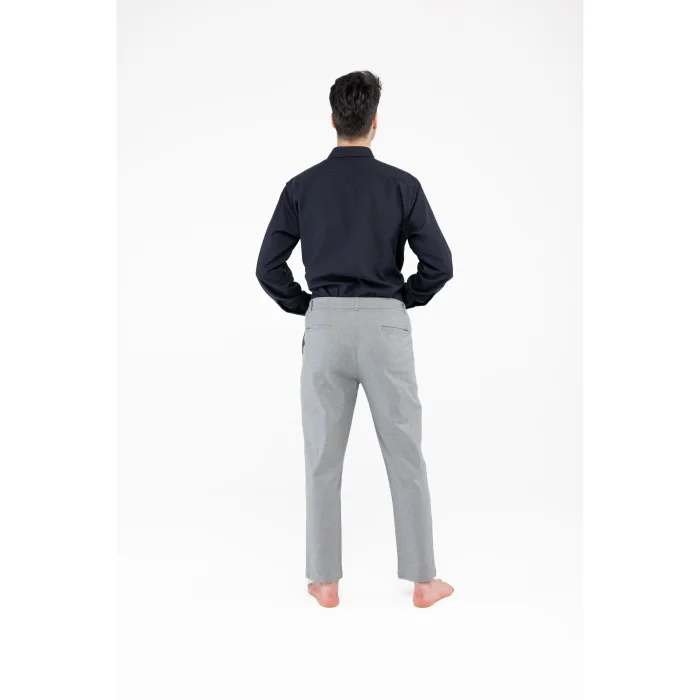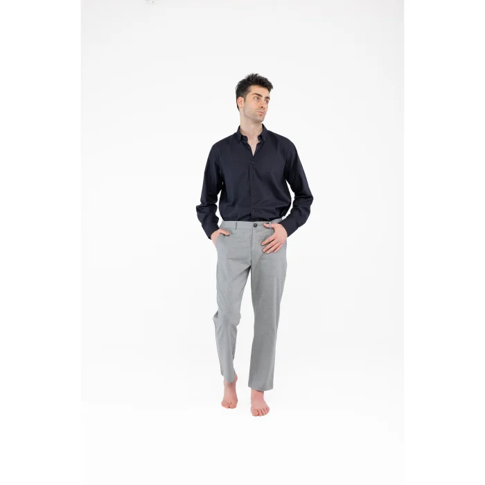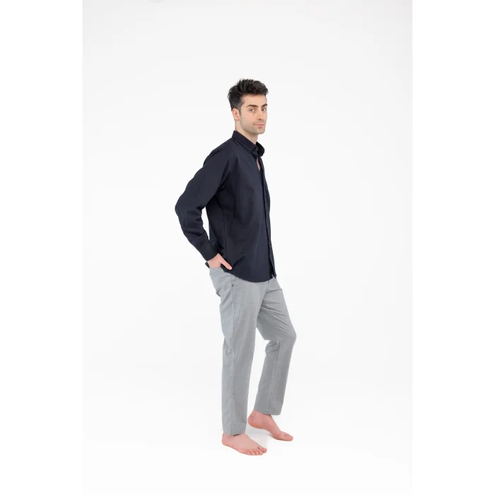 Adding comfort to modern urban style, these navy blue trousers offer an elegant look thanks to their slightly shiny surface while maintaining their form with their thick textured cotton fabric. Elastic panels on the sides of the waist provide freedom of movement and all-day comfort. The slightly tapered leg cut strikes an ideal balance between classic and comfortable.