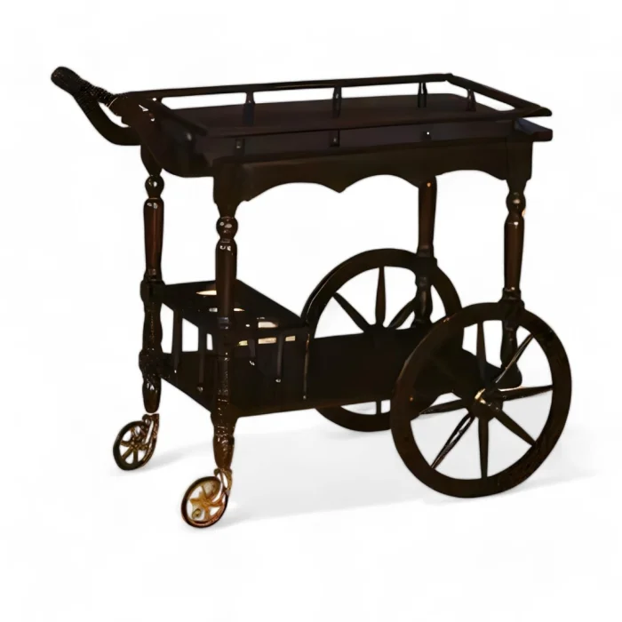 Its four large wheels, especially the decorative wooden wheels at the rear and the swivel wheels at the front, provide both an aesthetic and practical use.