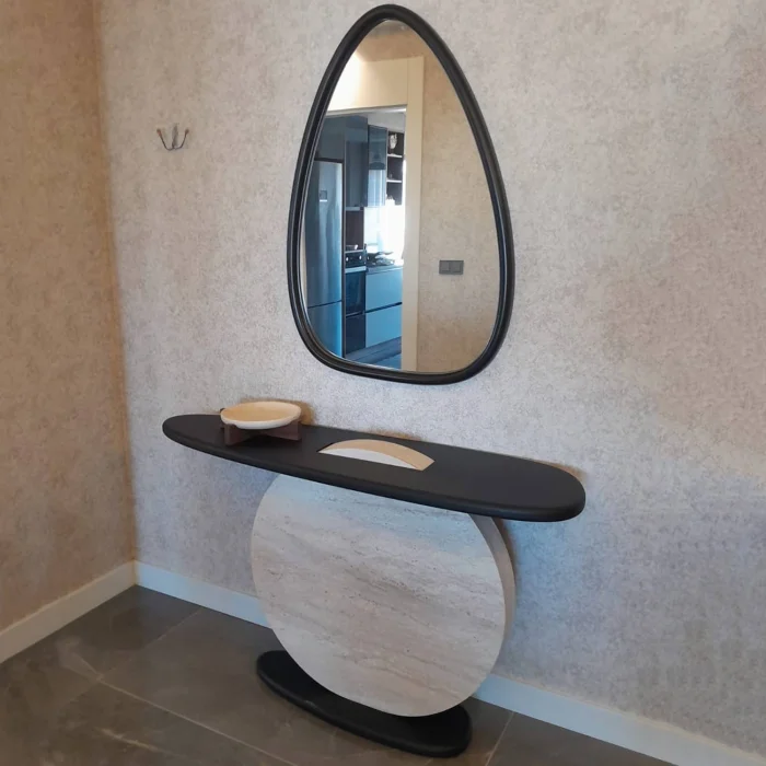 large organically shaped mirror at the top increases the depth of the space, providing a more spacious look, while also being the perfect complement to your daily care and make-up routine.