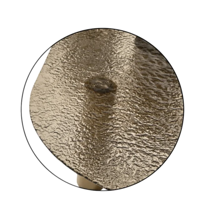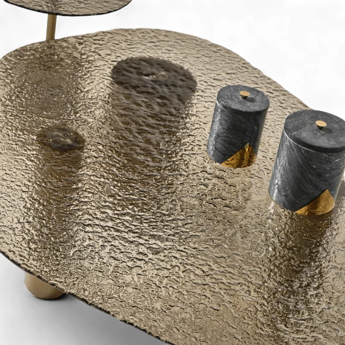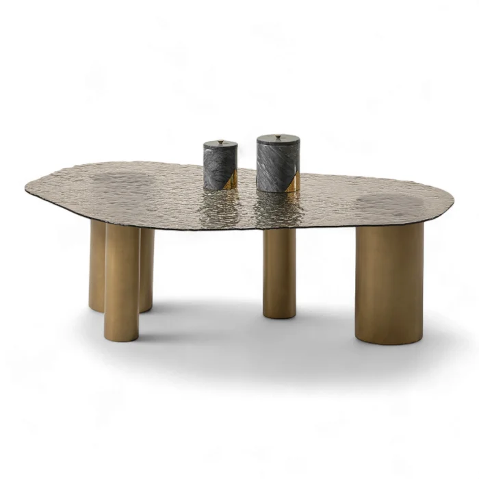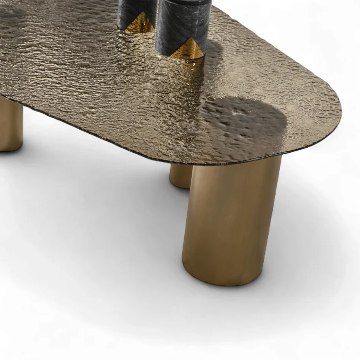 This coffee table, which carries mastery in every detail and character on every surface; It adds not only function but also a sense of work of art to your living space. While the textured glass surface reflects light from different angles, adding depth and movement to the space; The cylindrical legs in matte gold tones exude a strong yet simple stance.