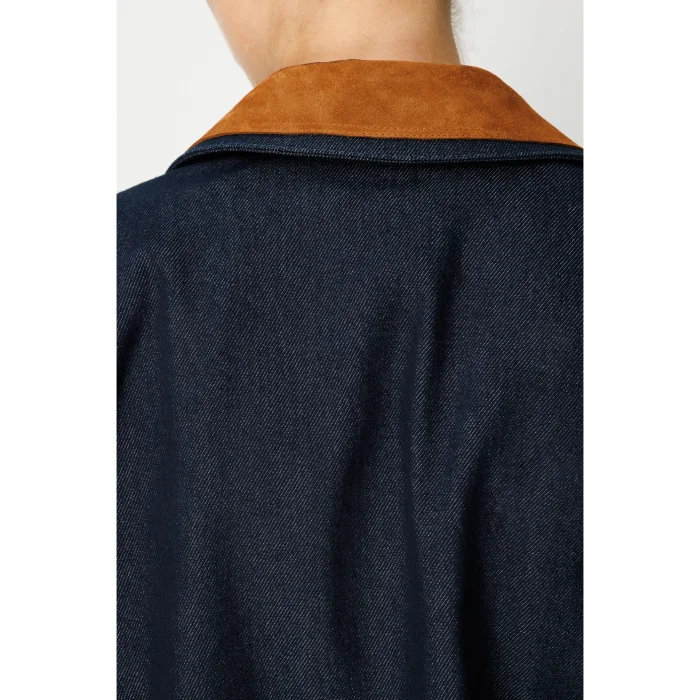 inner part of the collar and the suede transitions on the cuffs offer a sophisticated contrast to the denim texture with warm brown tones