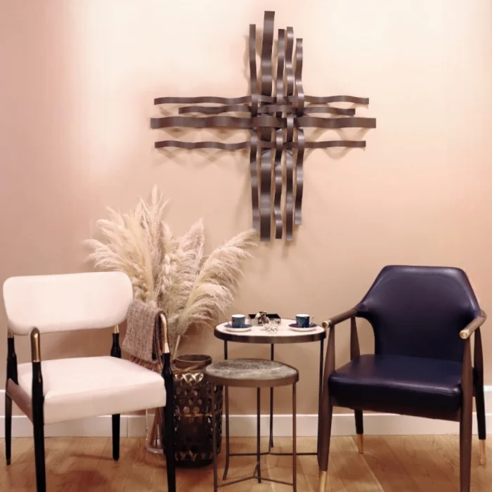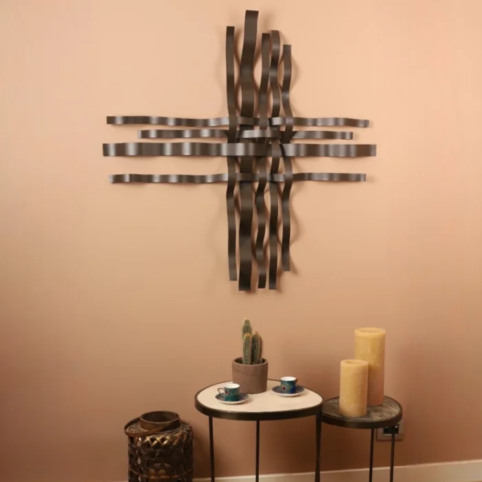 It consists of an amorphous composition consisting of brown static painted sheet metal strips.