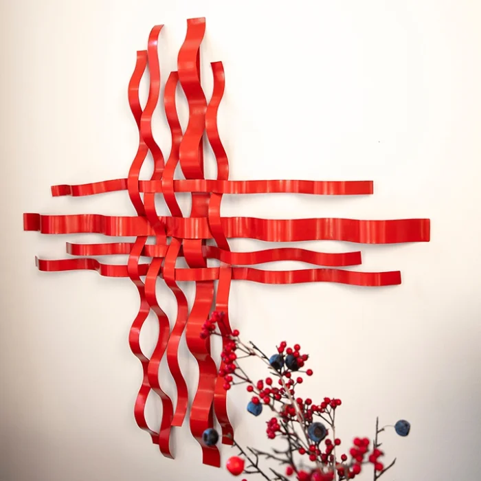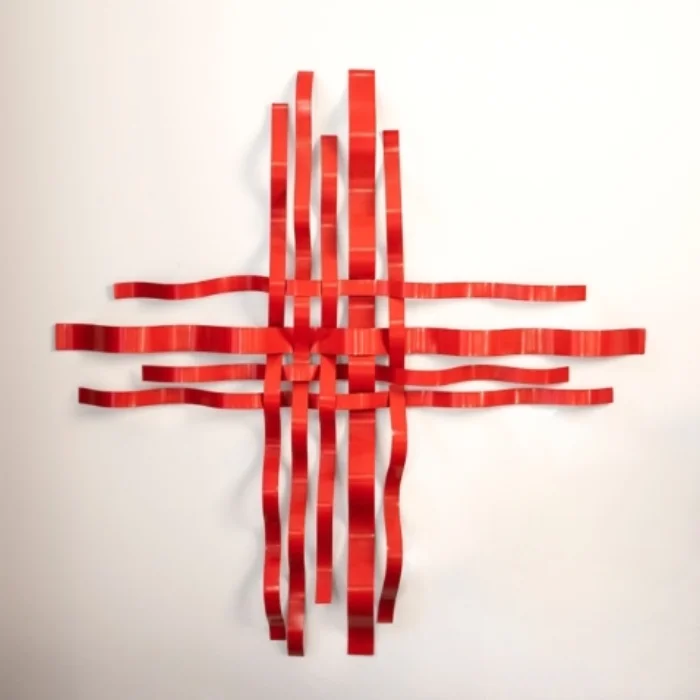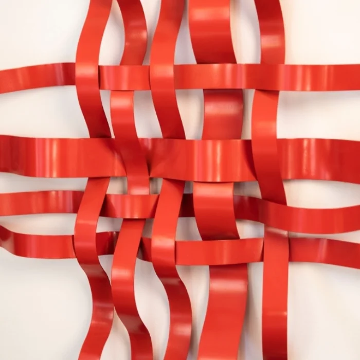 It consists of an amorphous composition consisting of red statically painted sheet metal strips.