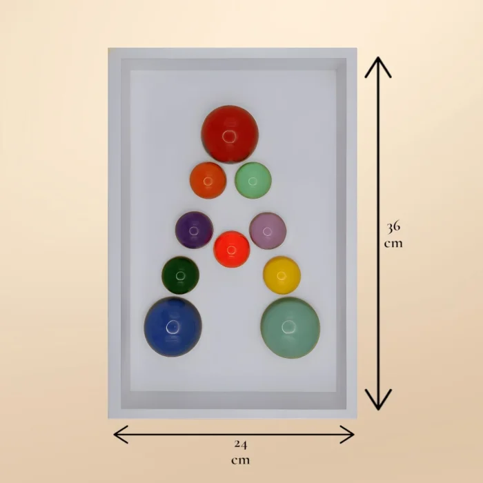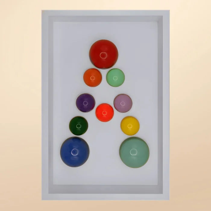 Itwas created by arranging epoxy hemispheres painted in pastel colors on the back in a wooden deep frame measuring 24x36x5 cm to form a letterform.