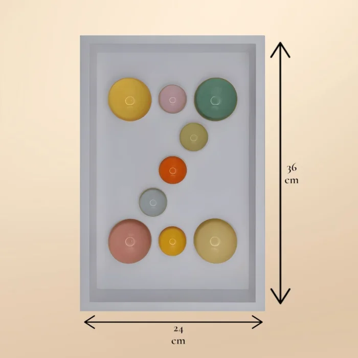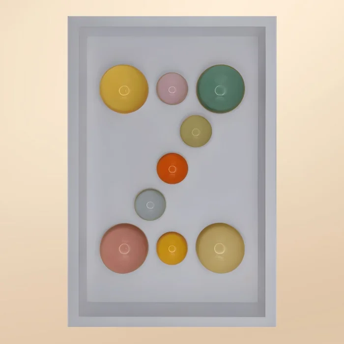 It is crafted by arranging epoxy half-spheres—painted in pastel colors on their back surfaces—into a letter form inside a 24x36x5 cm wooden deep-frame.