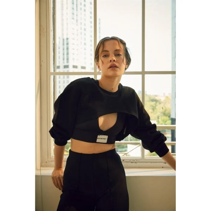 Deep crop sweatshirt with low shoulders, asymmetrical cut.