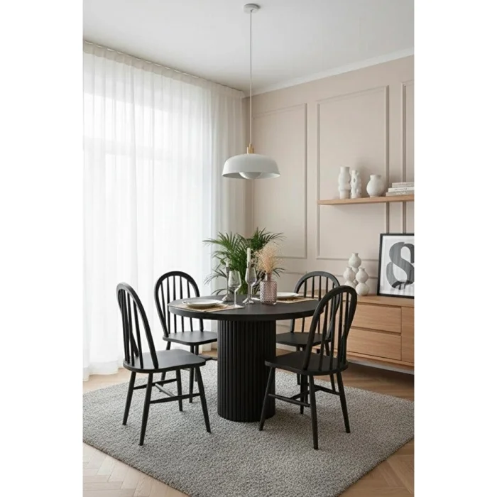 Oslo Black 100 cm Round Table Set combines the elegance of black with Scandinavian and bohemian lines. A timeless set with 1 table and 4 beech wood chairs. Oslo Black Round Table Set highlights elegance in both small and large spaces with its ideal size of 100 cm in diameter. The nobility of black color combines with the minimal lines of Scandinavian style and the natural warmth of bohemian details to create a timeless design. The 4 beech wood chairs in the set provide comfortable use for many years with their durability and ergonomics. Compatible with modern and classic decorations, this table set stands out with its functionality while adding a strong aesthetic to your dining room or lounge.
