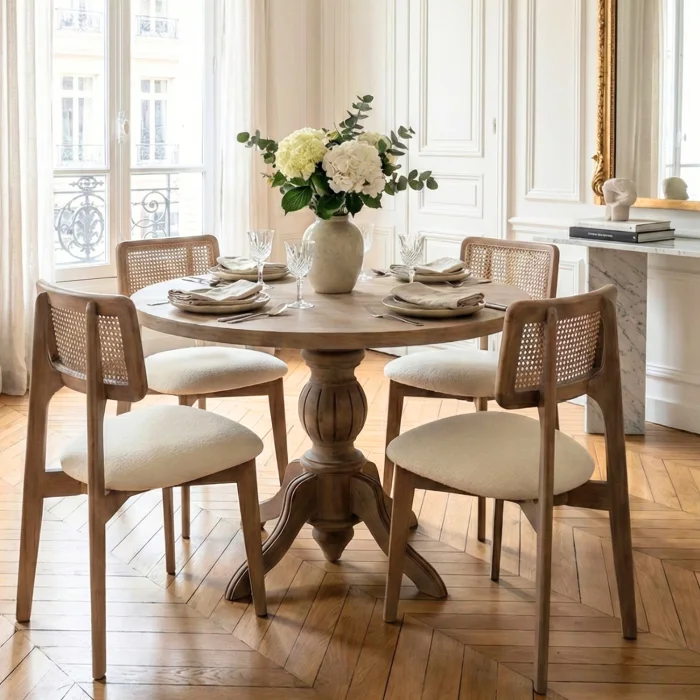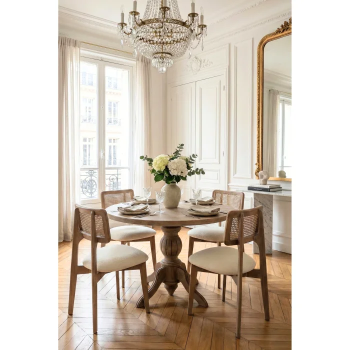 Woodenbend Rosense Antique Round Extendable Dining Table Set 100x100 - 4 Beech Chairs With Rattan Backing,