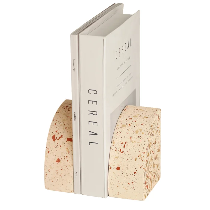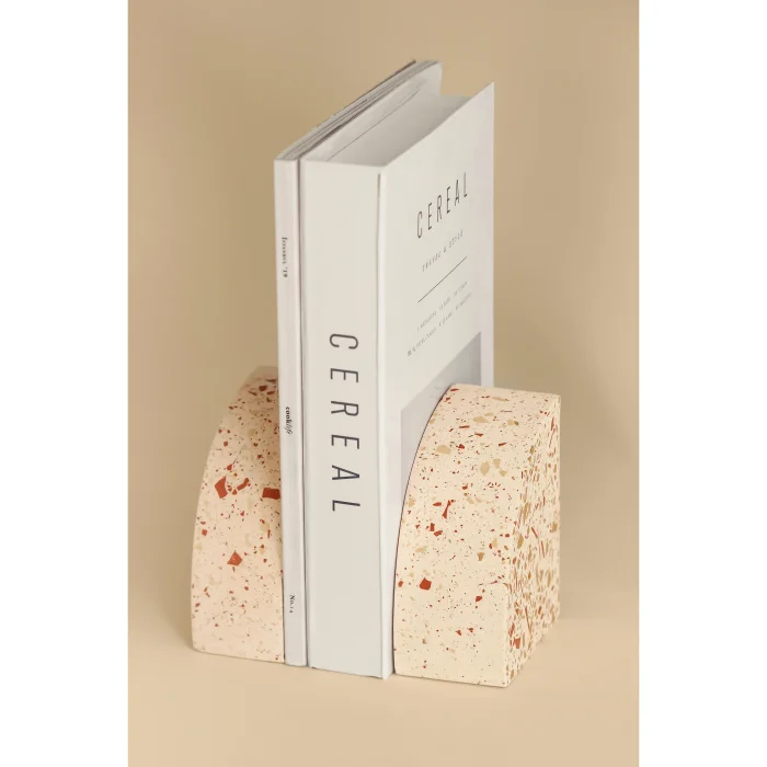 Thanks to its height of 12.5 cm and width of 10 cm, it holds books, magazines and catalogs in a stable and stable manner. Minimal form; It offers a stylish and simple look on desks, bookcases and shelves. Each handcrafted piece is distinctive and unique thanks to the natural distribution of the terrazzo pattern.