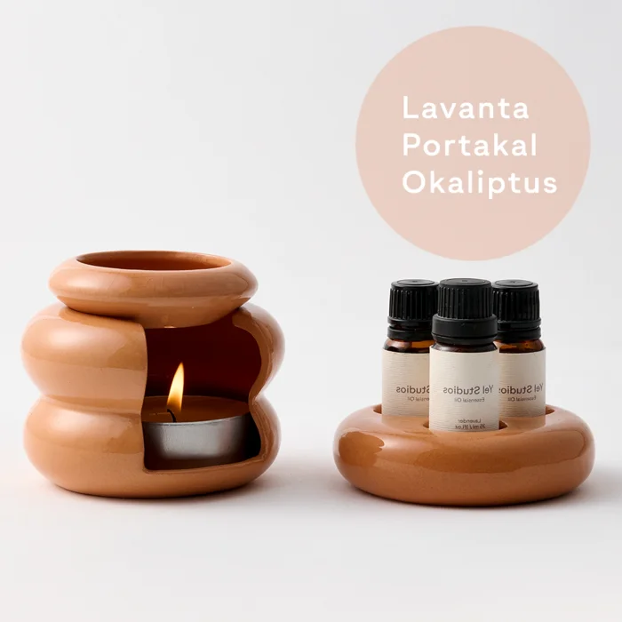 The complete set includes the oil burner, oil stand, and three essential oils (Lavender, Eucalyptus, and Orange).