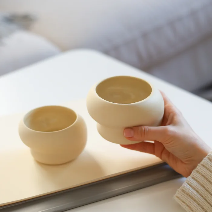 Handcrafted with care, the mugs bring together a modern, minimalist form with the calming presence of pastel tones. Thanks to the natural character of ceramic and the visible traces of the production process, each piece is one of a kind, transforming the set into not only a functional object but also a collectible design piece.