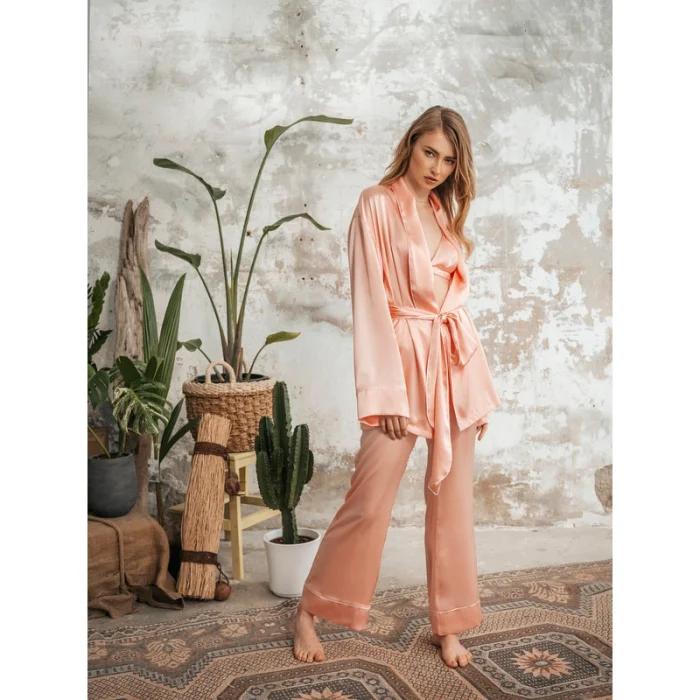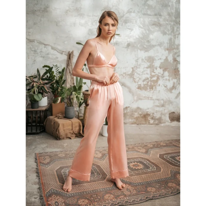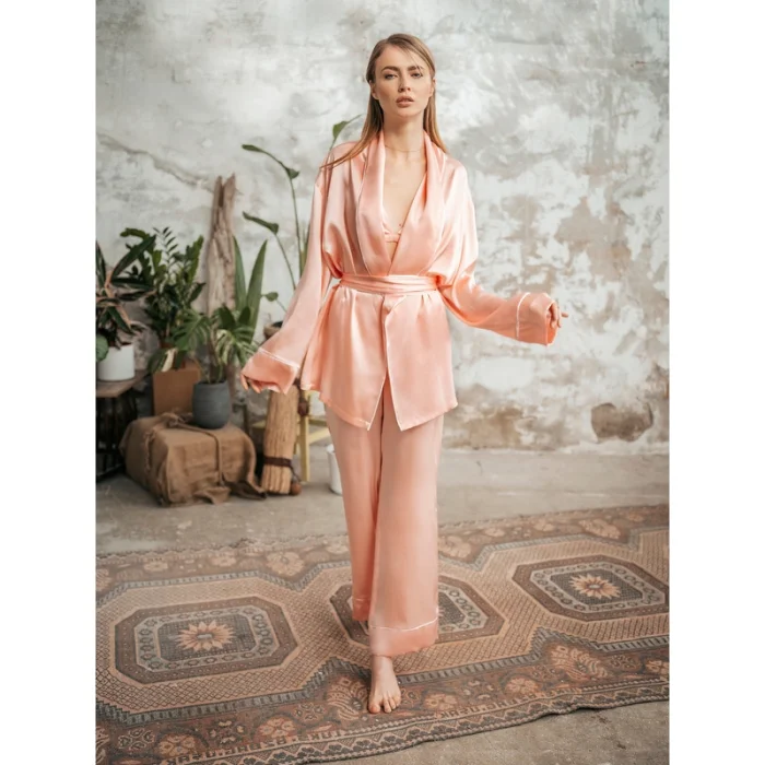 The Elegant Collection series is designed with pure materials. It is a product of top quality materials and design.Silk pajama set is delivered in a special cover. Dry cleaning or hand washing with cold water is recommended.