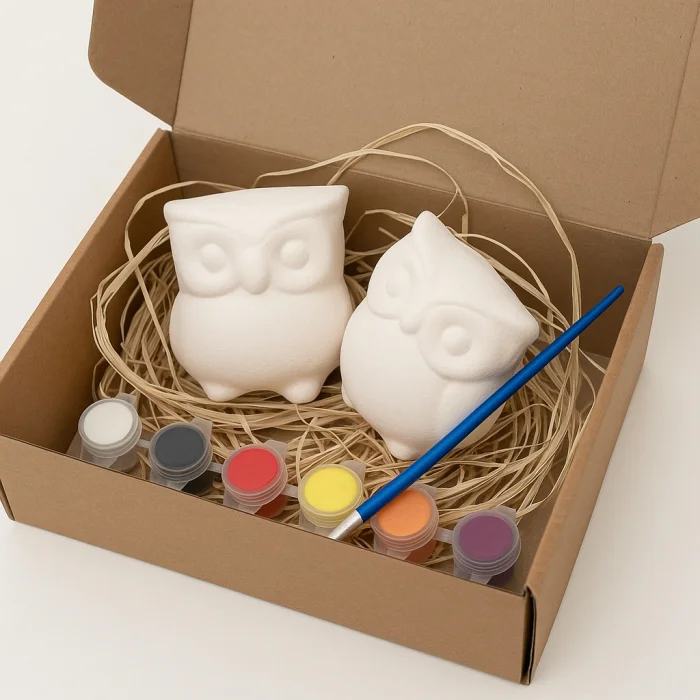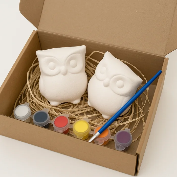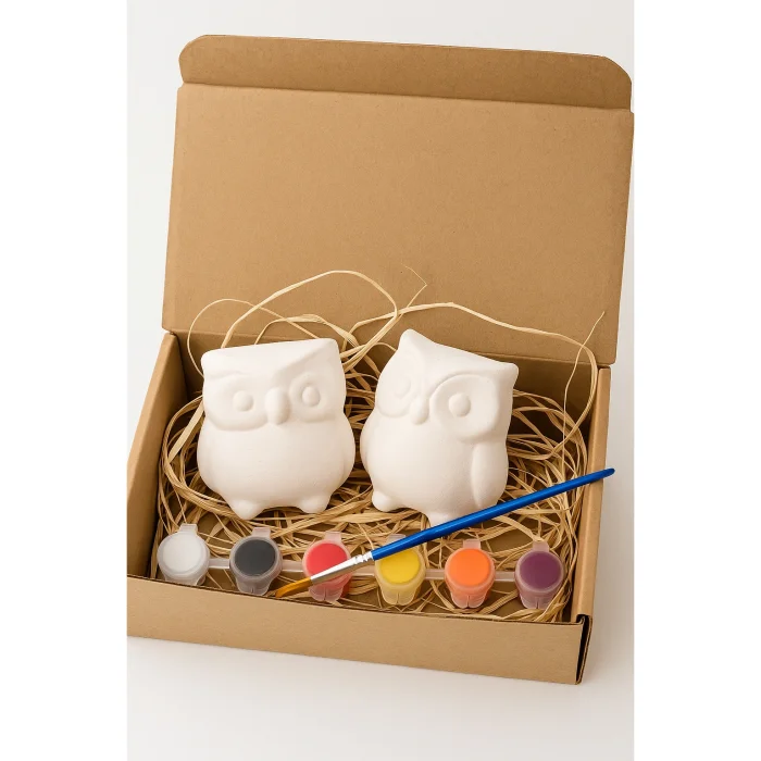The Ceramic Owl Painting Set offers a fun and creative activity for both children and adults. The set includes 13 vibrant paint colors, 1 detailed ceramic owl figure, and 1 paintbrush. Everything you need to freely express your imagination is right here in this set!