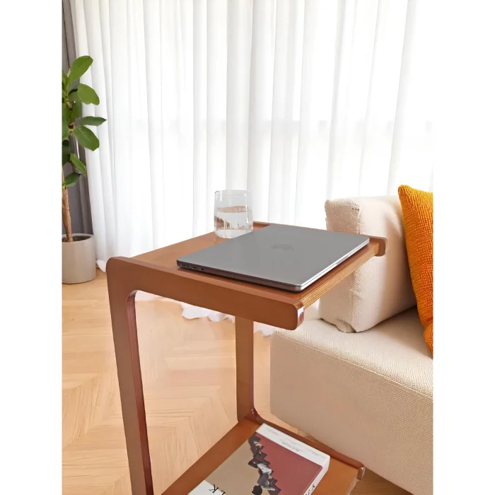 Its curved form, which meets the warmth of the wood, balances aesthetics and usefulness. The bottom shelf offers an ideal space for magazines or books, while the top surface provides a practical solution to your daily needs.