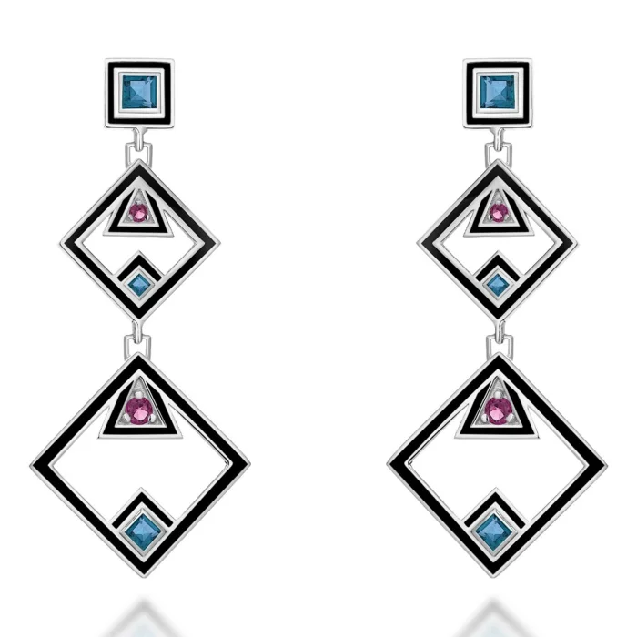 925 sterling silver is given an elegant sparkle with 14-carat micron white gold plating. The design is complemented by stunning Swiss Blue Topaz and eye-catching lab-made pink sapphire stones, offering a touch of sophistication and striking elegance.