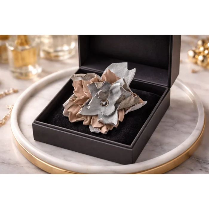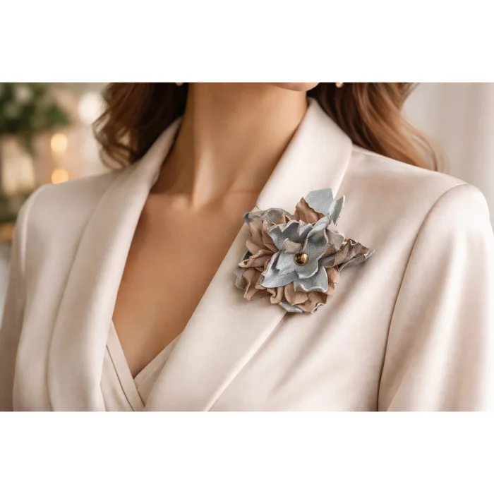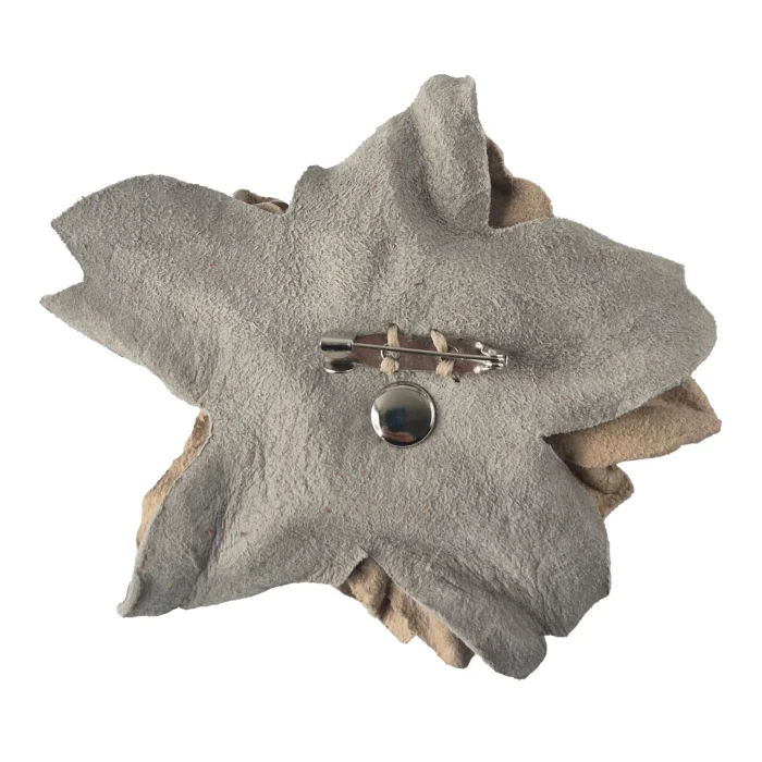 Özel olarak tasarlanan bu el yapımı deri çiçek broş, doğallığı ve emeği estetik bir formda buluşturur.