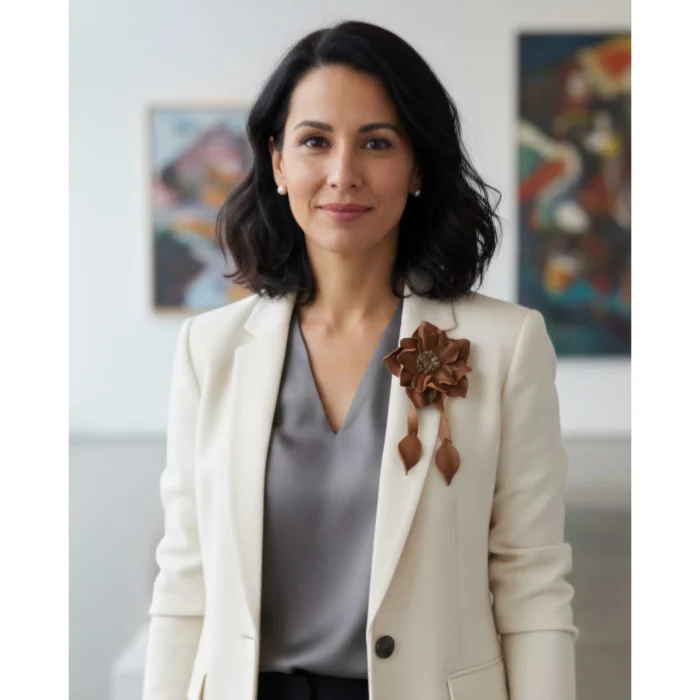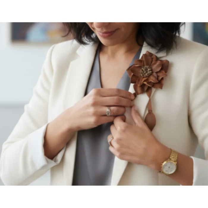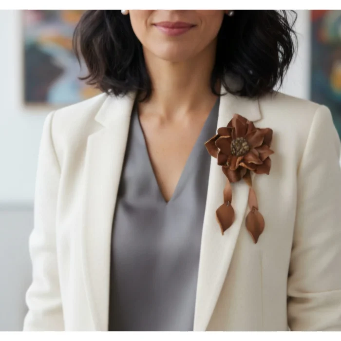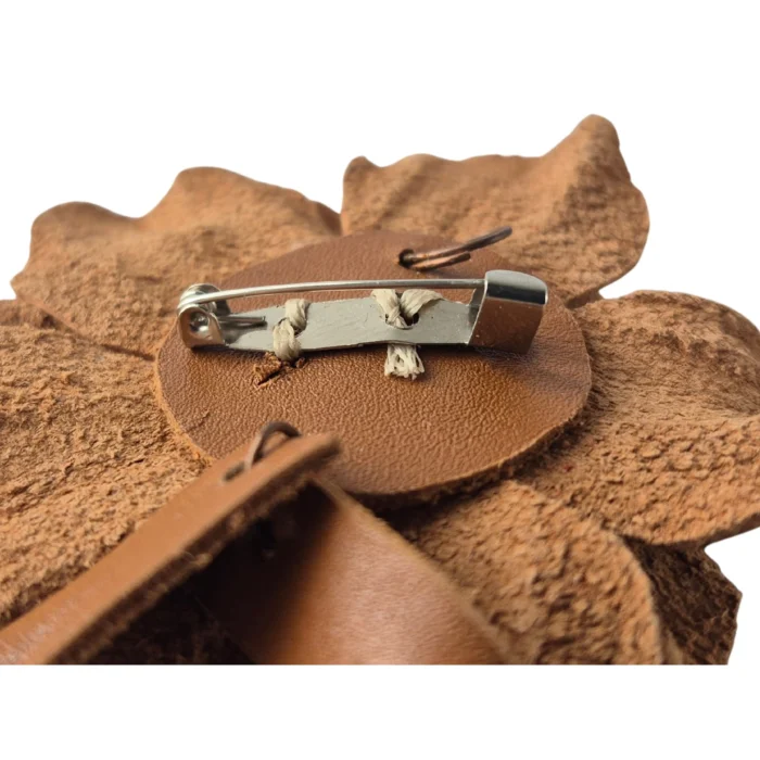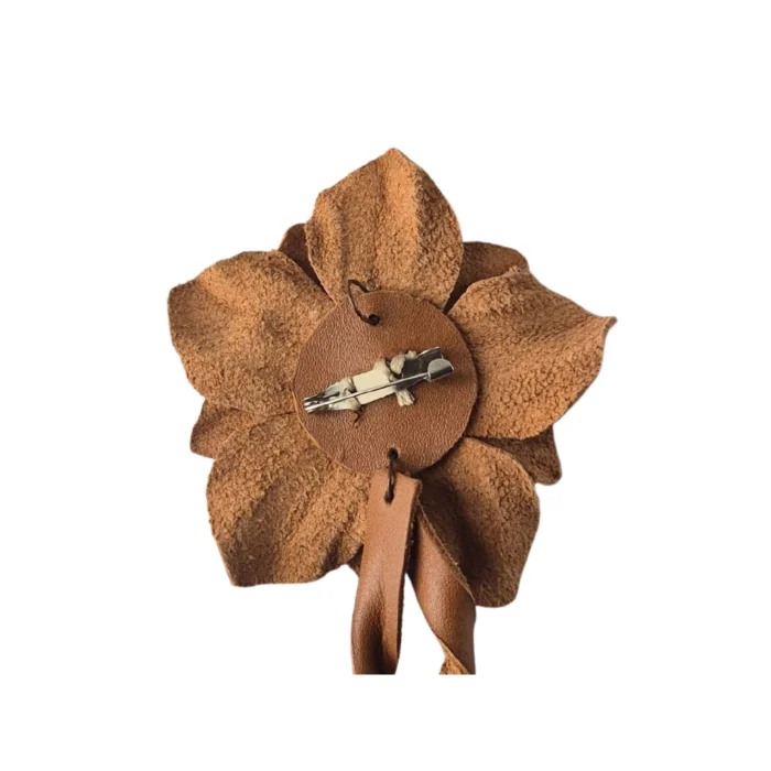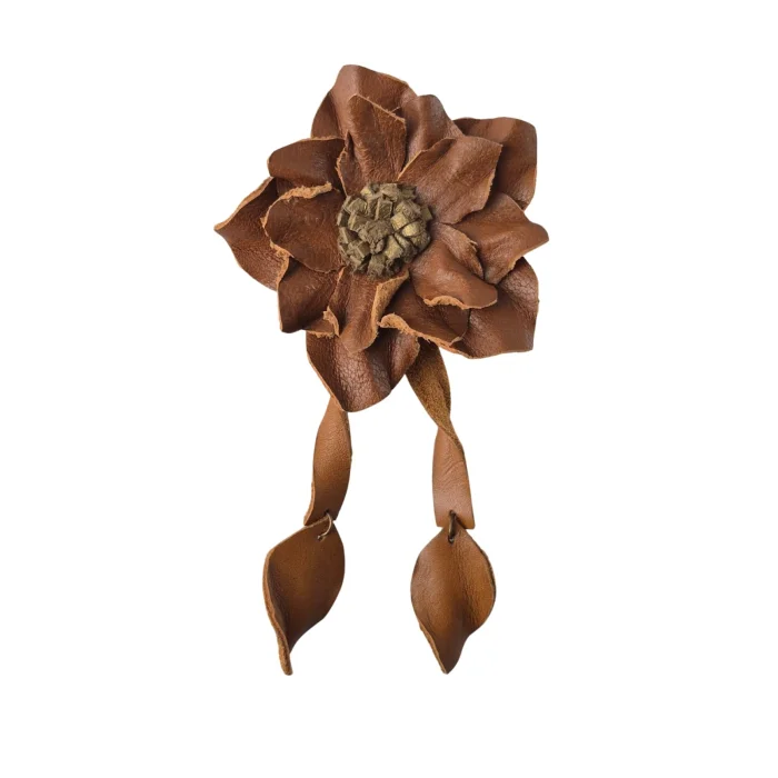 Boutique Tags: Leather brooch, flower brooch, artistic accessory, romantic detail, handcrafted, handmade design, women's craftsmanship, genuine leather, natural materials, timeless elegance, romantic touch, sustainable design, limited production, special gift