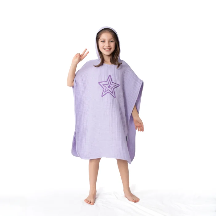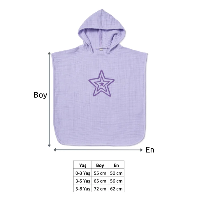 Our 4-Ply Embroidered Muslin Poncho Muslin products are made of 100% organic cotton. It is unisex and full fit. There is an embroidery detail with polyester-free thread. It is GOTS certified. Even the muslin poncho woven label is made of 100% cotton. Our ponchos, which you can use instead of towel ponchos and bathrobes after bathing in spring and summer, can be easily put on and taken off. Lightweight, absorbent and quick-drying soft Zuppers ponchos are also ideal for after bathing & sea & pool with their comfortable fit and hood. Muslin products are durable, breathable, and compatible with your baby's gentle skin with their soft texture. Thanks to the type of weaving, it becomes softer every time it is washed. Our muslin fabric, which is produced with 4 layers of weaving, has a self-shrinking texture after washing. If desired, it can be ironed and straightened again. After the first washing and drying, there may be a possibility of 3-5% withdrawal of the product from the length. Product Details: Size Options: 0-3 Years/ 3-5 Years/ 5-8 Years *0-3 years old product length from shoulder to hem: 55 cm Width 50 cm *3-5 years old Product length from shoulder to hem: 65 cm Width 56 cm * 5-8 years old product length from shoulder to hem: 72 cm Width 62 cm 100% CottonDesigned and manufactured in Turkey. It can be washed in the washing machine at 30° with similar colors. Do not tumble dry.