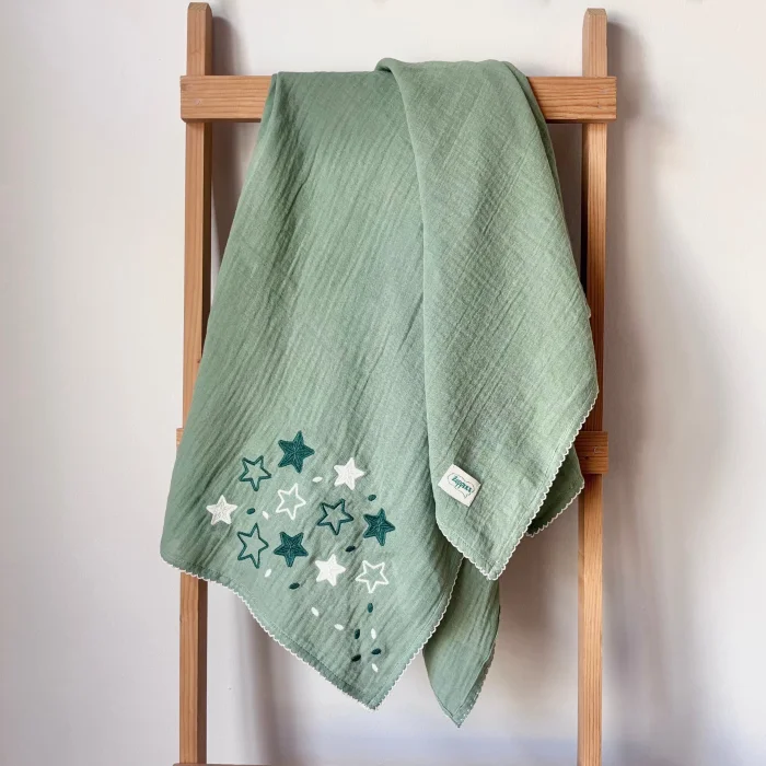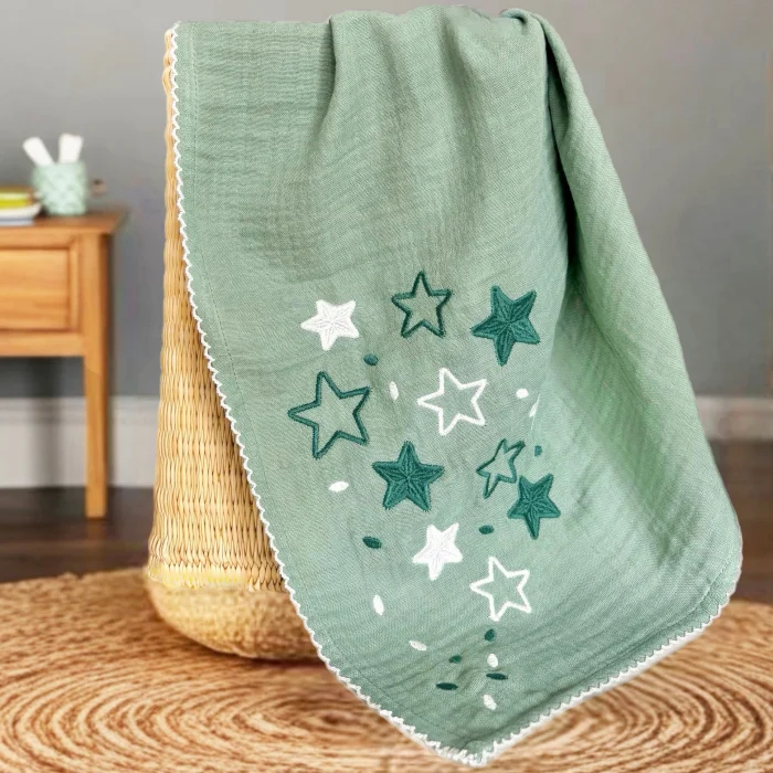 is produced with 2 layers of weaving and is also suitable for swaddling thanks to its 100*100 cm large size size.; It has gray pompom embroidery on ecru.; It is Oeko-tex certified, consisting of natural ingredients for babies; The muslin cover is durable, breathable, and compatible with your baby's gentle skin with its soft texture.; Even the woven label is made of 100% cotton; The muslin blanket softens even more after washing and has a self-crimping texture.; If desired, it can be ironed and flattened again.100x100 cm Muslin cover usage areas:Cover blanket while sleeping in bed or strollerStroller sunshadeBaby bed linen Newborn envelope swaddleDiaper opening coverShoulder coverGuest cover to lay under the babyDrying CoverPlay matIt can be washed in the washing machine and by hand at max 40°C.; It can be ironed at low temperature.; Tumble Drying is not recommended for cotton products; 100% CottonDesigned and manufactured in Turkey; 100% Cotton